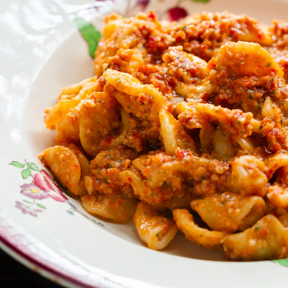 This plate of pasta is great with a glass of red wine such as Primitivo di Manduria, but can also go well with a wine white like Verdeca, and indigenous grape from the Valle d’Itria with a fresh, slightly fruity flavour.
