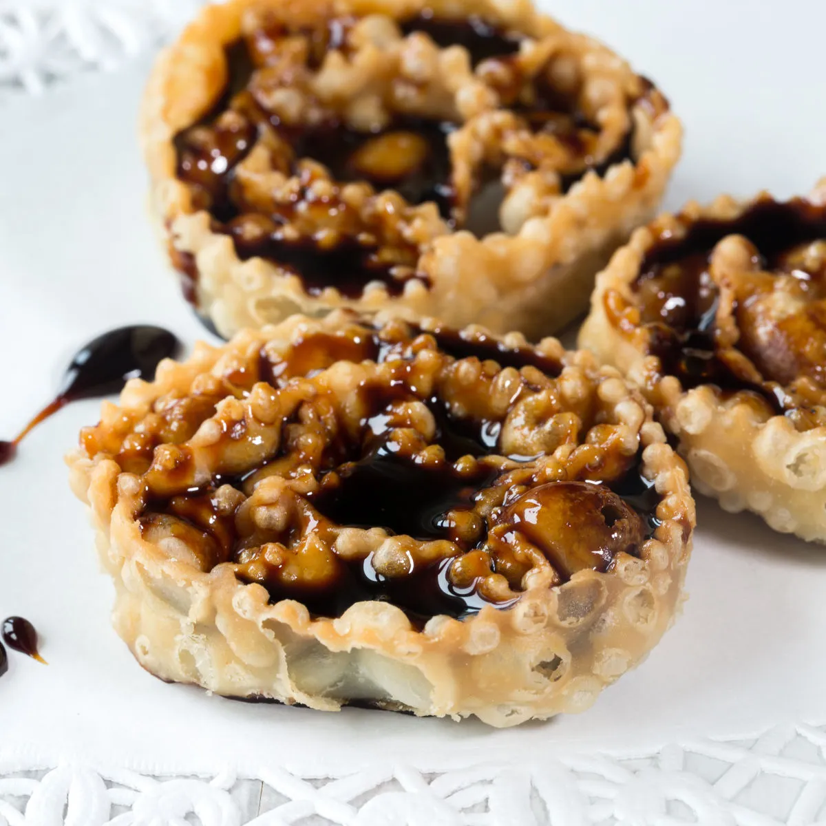 Known as Carteddate in the local dialect, Cartellate are from Foggia and Gargano and are traditionally eaten at Christmas time. They are irresistible thanks to their unique flavour, crunchy bite, and pretty flower-like form. The pastry is made from flour, oil, white wine, salt, and water. It is rolled out on a pastry board and cut into strips with a serrated blade. These strips are then wrapped around themselves to create the distinctive shape. After being fried, they are then covered in honey or vincotto. As a final touch hazelnuts, almonds, or chocolate are sprinkled on top.