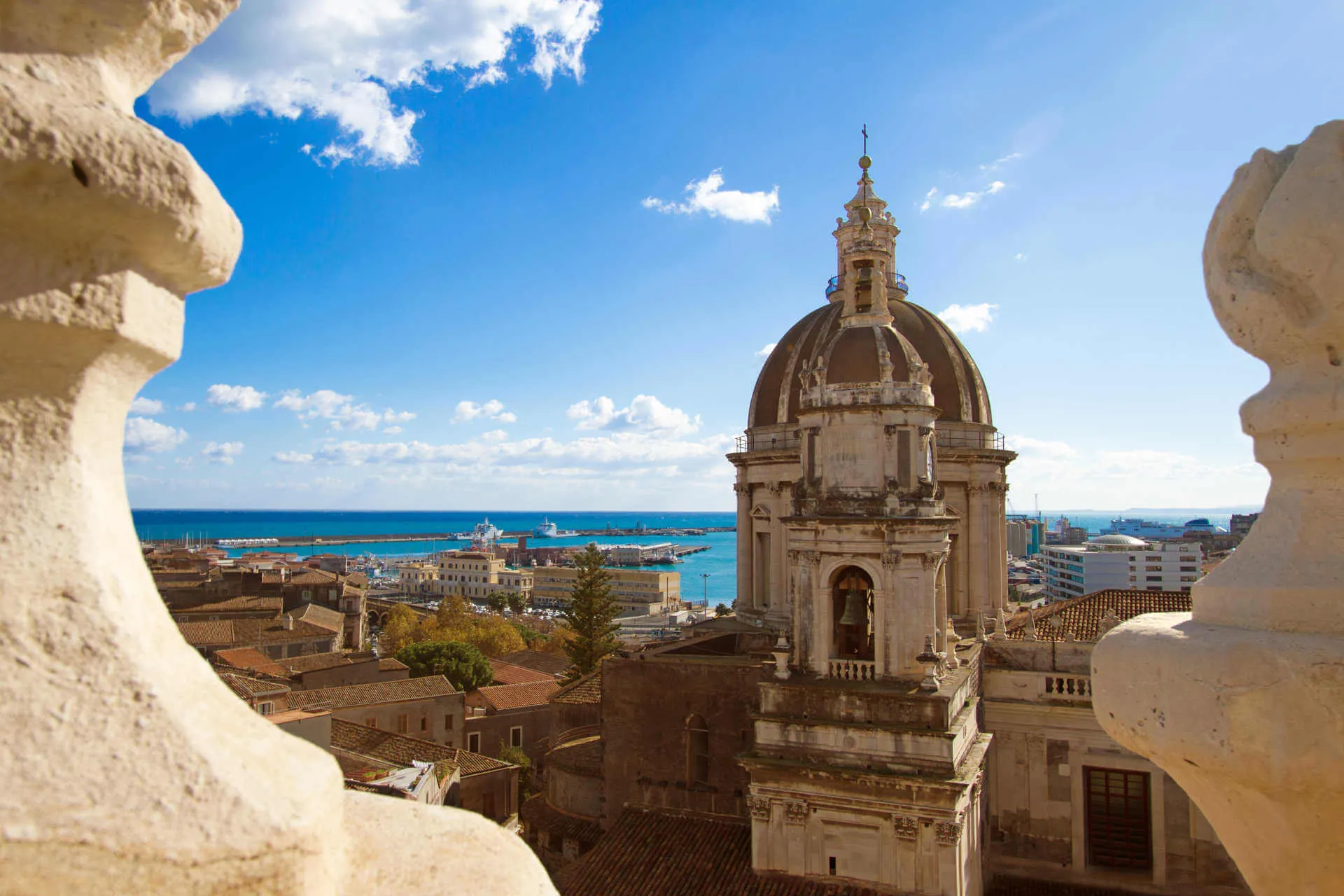 La côte catanaise se distingue par son paysage volcanique, avec des falaises noires et la silhouette imposante de l'Etna en arrière-plan. Depuis la mer, Catane montre son côté le plus sauvage, où la force de la nature et l'histoire de la ville se fondent en un seul panorama extraordinaire.