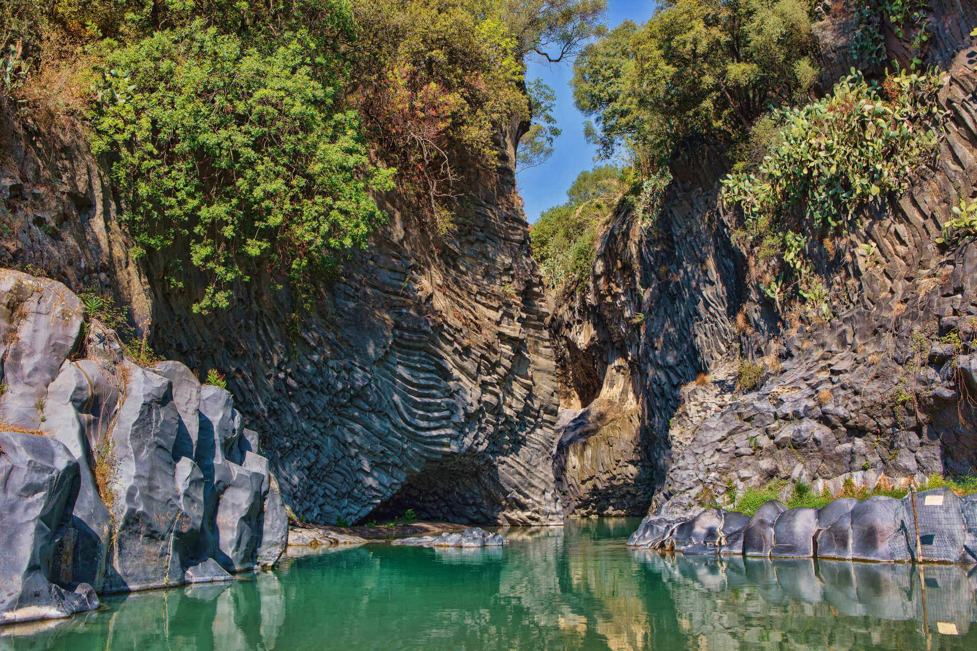 Les Gorges de l'Alcantara, situées dans la vallée de la rivière Alcantara, représentent l'un des phénomènes géologiques les plus spectaculaires de l'est de la Sicile. Ces formations rocheuses impressionnantes ont été créées par l'érosion des eaux de la rivière sur les coulées de lave basaltique provenant du mont Etna. Le résultat est un canyon majestueux, avec des parois s'élevant sur des dizaines de mètres, créant un paysage presque lunaire accentué par le contraste entre la roche noire brillante et la végétation luxuriante environnante.