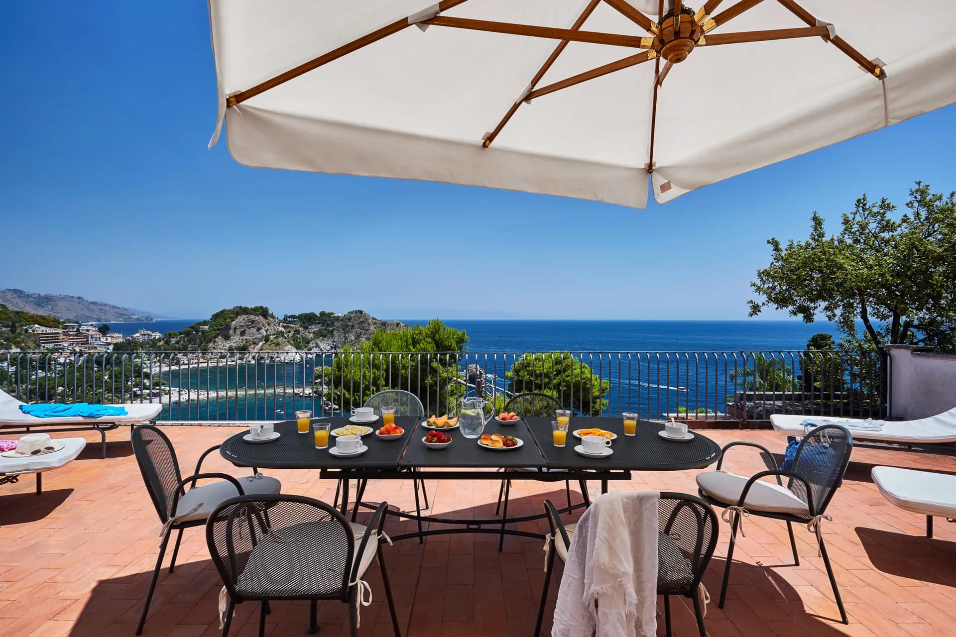 La Benvoluta is a spacious villa, in one of Sicily’s most popular resorts, easily able to accommodate large groups or two families. The villa’s enormous outdoor terraces overlook Taormina beach and the tiny island of Isola Bella and the cable car up to the boutiques, cafés and gelaterie of Taormina centre is a 15 minute walk away.